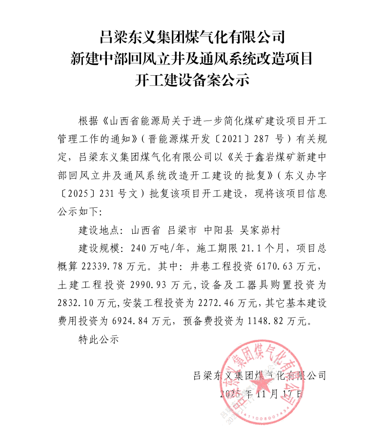 呂梁東義集團(tuán)煤氣化有限公司新建中部回風(fēng)立井及通風(fēng)系統(tǒng)改造項(xiàng)目開(kāi)工建設(shè)備案公示