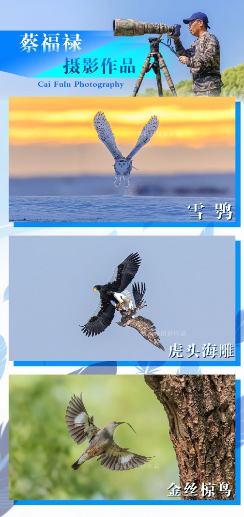 2016年,原本專注風光攝影的老蔡受攝友啟發(fā),剛開始嘗試拍攝鳥類,他就被鏡頭里充滿生機的畫面深深吸引。初嘗拍鳥樂趣后,他的攝影方向很快從風光攝影轉向鳥類攝影。不同于靜態(tài)的風光攝影,鳥類拍攝需要具備高速連拍的攝影器材、隱蔽追蹤的技巧,熟悉鳥類習性。為此,他自駕車造訪了長白山、云南高黎貢山、百花嶺、盈江等觀鳥勝地,與多名拍鳥愛好者交流心得。他曾在零下35℃至零下40℃的海拉爾雪地蹲守數(shù)小時,只為捕捉雪鸮的生動瞬間。鳥類攝影不僅是技術挑戰(zhàn),更是與自然的深度對話——只有了解了鳥類的習性,才能定格生命的靈動。