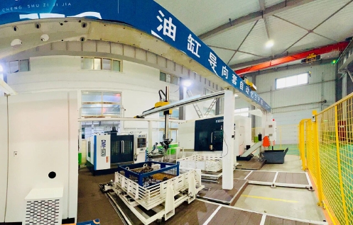 清晨8點的通用重機公司機加工車間,金屬切削聲有節(jié)奏地交替進行著。 油缸導向套自動化生產線正“絲滑”地運轉,機械臂懸停的位置精準得毫厘不差,指尖鉗住毛坯件后順著軌跡滑向車床,裝卡、車削、鉆孔一氣呵成。