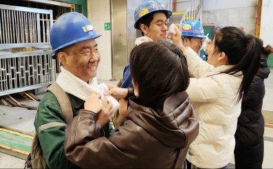 活動日早上,家屬們早早等候在井口,手中拿著鮮花、毛巾和象征平安的蘋果,面對身穿沾滿煤塵工裝的親人從罐籠中走出,她們快步上前,有的用毛巾輕輕擦拭親人臉上的煤塵,有的遞上解渴的溫水,有的將蘋果塞進(jìn)親人手中??吹矫婺亏詈诘挠H人,她們才明白平日里只知親人工作辛苦,此刻才真切感受到這份“黑”背后的不易與擔(dān)當(dāng),更懂“平安歸來”四字的千鈞重量。